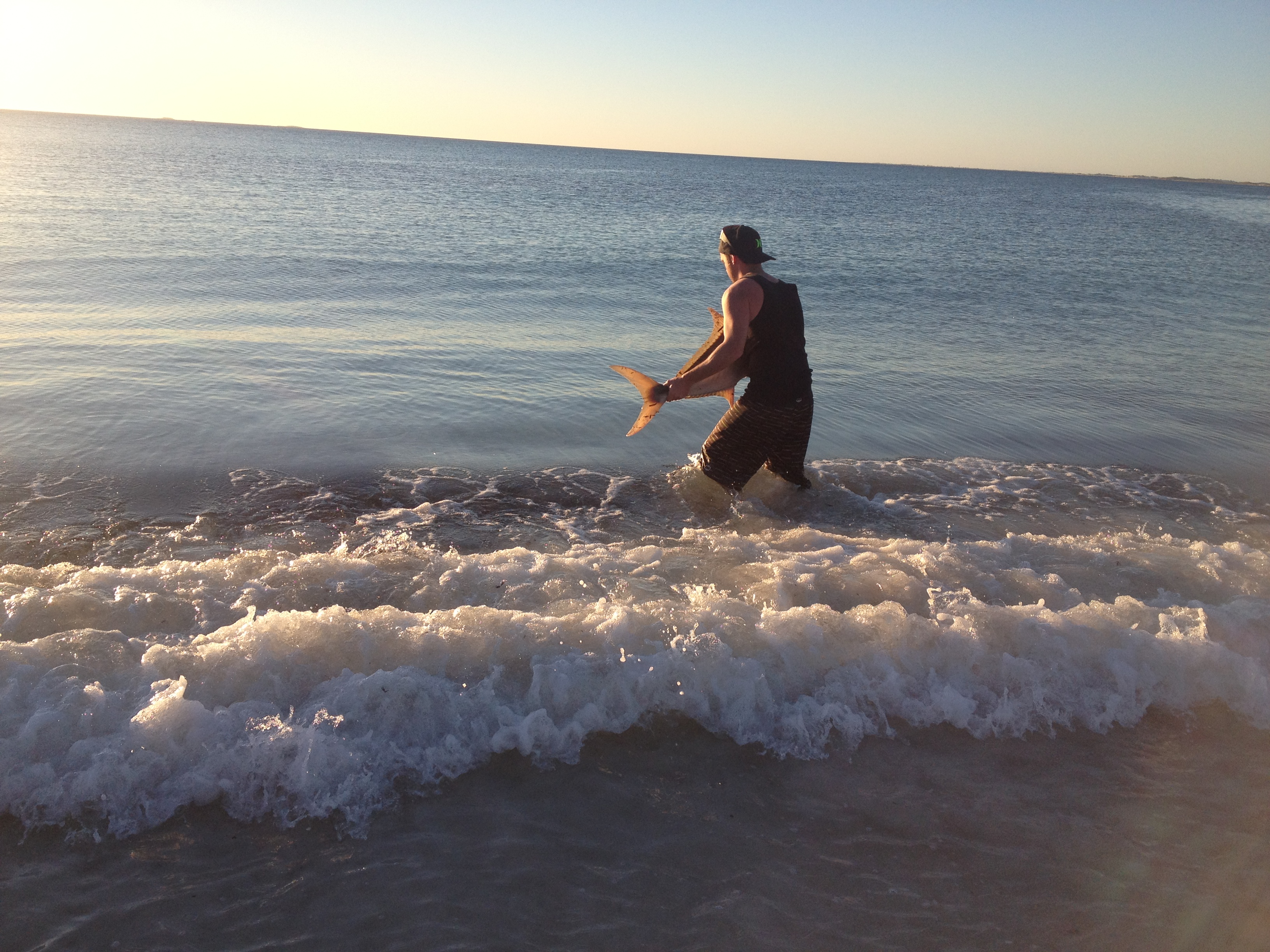 After a quick bite to eat it was time to send the ballons out.So i've chucked on a whole mullet about 40cm long and cast it out 30m or so, backed the drag rite off and put the rod in the holder to do its thing.I was still setting up all my other rods and i had to run back over to camp to grab my tacklebox to find that when i got back to my rod it was bent over and taking line like i've never seen before in my life.So i've picked up my rod,set the hooks, tightened the drag up and held on.After 15 minutes of fighting and 2 big jumps out of the water i dragged a massive sambo around 23kg up onto the beach and i was speachless.i took a few photos cut the leader and spent the next 20mins trying to release the fish but it swallowed the hooks to far down and made a mess of its self .I didnt want to waste the fish so we cooked it up on a fire on the beach and it fed most of the camp site so that was a plus.It wasnt no dhuey but it was better than eating samon.we fished the rest of the day and i ended up with two more both around 16-17kg.One of them was caught on 30lb and gave me a fight of a life time.Im still blown away by this experience and i hope its not to long before i get to do something like this again.It sure does make up for the last 3 months of fishing through this shitty weather and only catching string rays.