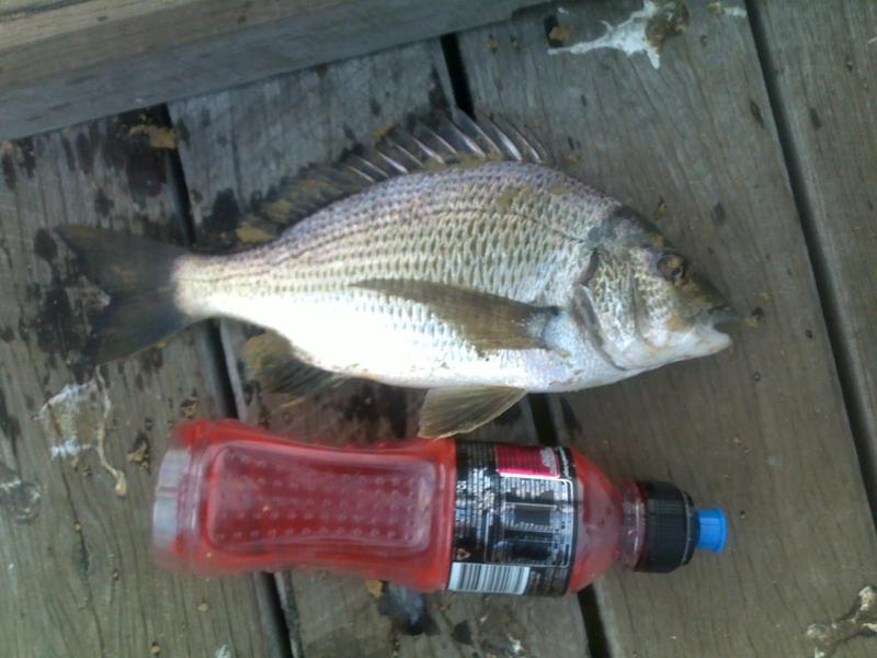 Next I got another slightly smaller one but still pulled line, not enormous but not tiny either. Didn't clean him up as much as I should've for the photo but I needed to get him back. Put him next to a powerade bottle so you have some idea of the sort of size.