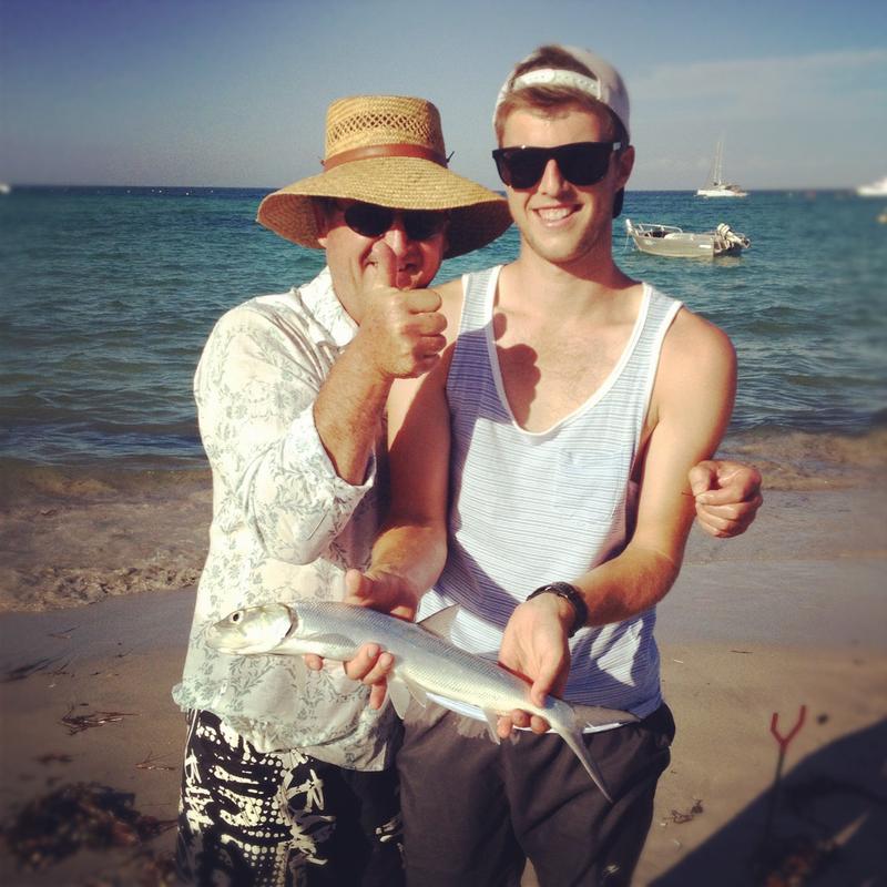 The first interesting catch of the holiday was when I was just throwing a standard paternoster rig with prawns around the moorings near Toby's inlet and after catching a few sand whiting something took my bait with quite a flurry and I new straight away that I wasnt onto a whiting, then it started peeling my 4lb braid off at quite a pace and then it jumped and I thought that it was small Salmon which was lost. But when I got it close to shore and standard walking backwards on the beach to land it I realised that it was a Giant Herring, but i thought that this was as close as i was going to get to it because it spat the hook when it was right on the shoreline in about 2cm of water, but my Dad who was fishing about 15m down the beach sprinted over and grabbed it out of the white wash and we measured it in at a healthy 59cm. Was quite a surprise to catch one because I had never seen one before let alone caught one, but i was stoked!