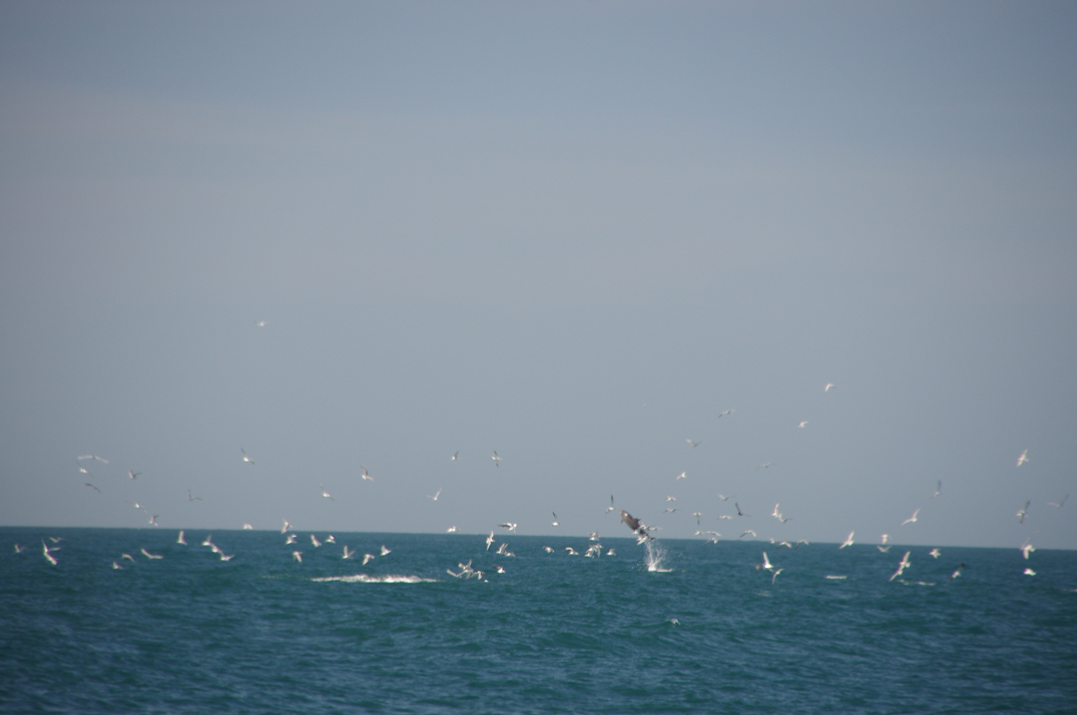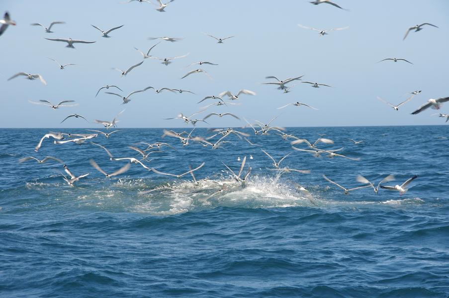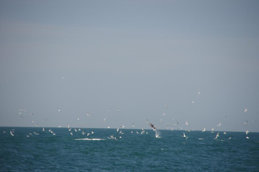 Best part of the day by far was watching an enormous bait ball getting smashed from underneath by dolphins (including one launching through it - see attached photos), tuna and I am pretty sure I also saw a shark lurking in the depths, and masses of birds from above. Could have watched the action for ages. Unbelieveable how close all the action was - the bait ball took refuge under our boat until the tuna herded them out again. Amazing.