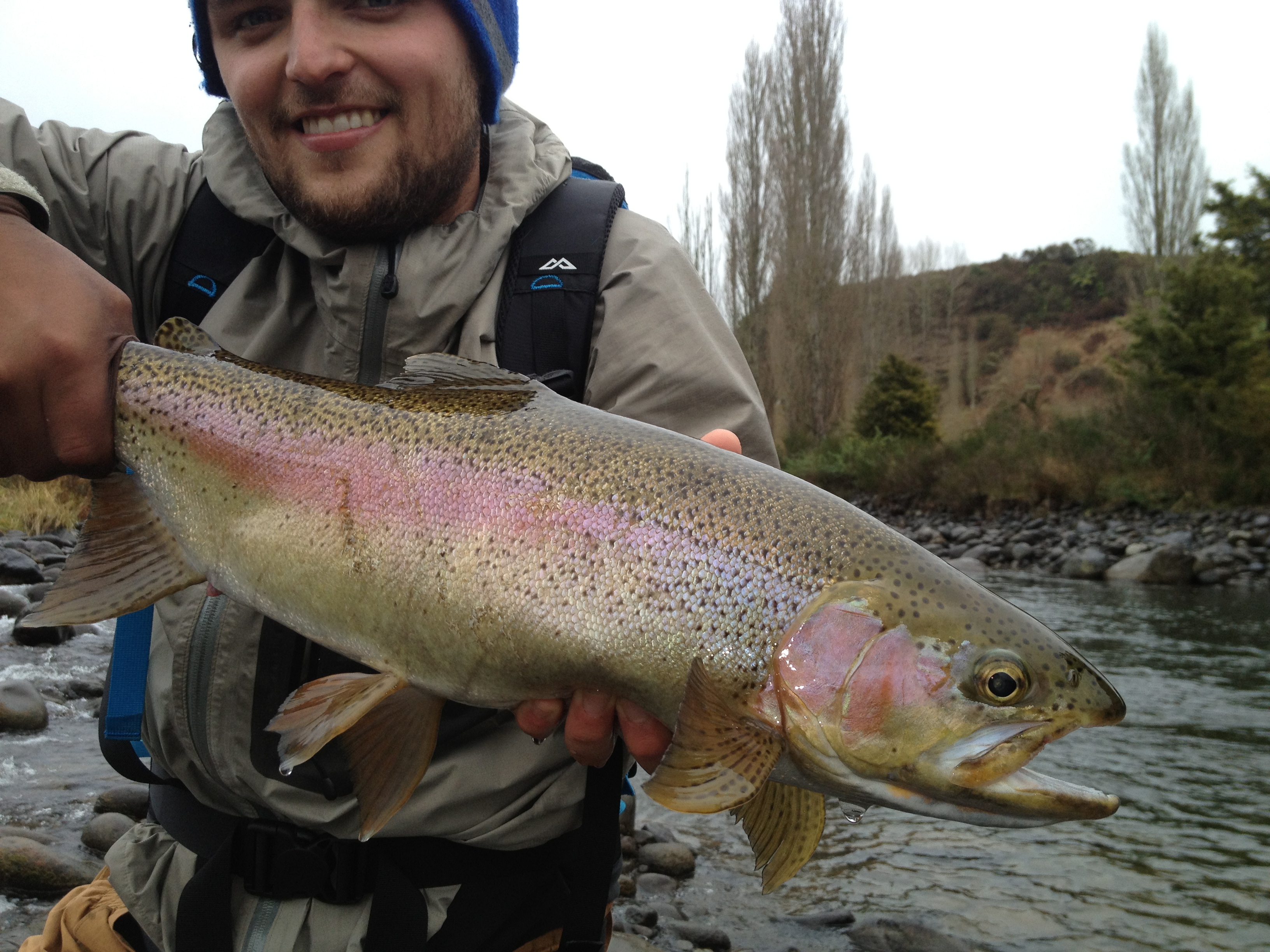 We headed off into the AWSOME senic landscapes of rolling hills, fog in the vally, till we finally came to a point in the river. Right he said pointing out where to cast, where they will be sitting etc etc. Hes teaching me as eventuelly im going to do it by myself and venture out into the wilderness all on my own. The first hour not much was happening, till my guide noticed some orange peel and a couple foot steps directly behind we were fishing, right he saids stop fishing the edges, extend your trippet and straight in the fast water. First cast bang i was on. A nice small 4 pound rainbow was soon on the shore. Again next cast right into the middle o the fast water, and bang i was on with a slightly bigger , very acrobatic rainbow going 5 pounds.
