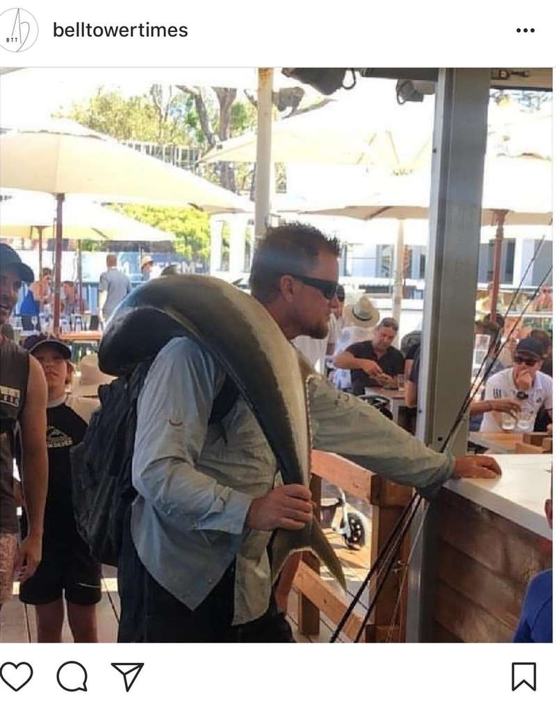 rocks into the Rotto pub for a beer with catch of the day over his shoulder :-) haha
