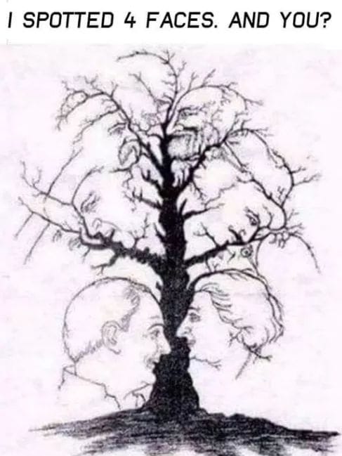 The one you may not be seeing is the smaller face looking upwards which is towards the tip, on the underside of the bottom left branch
