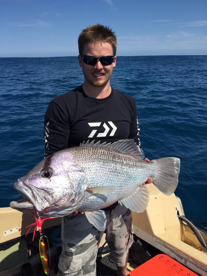 Headed out to the 40m contour and a small feint show of bait on the sounder...line up the drift and down went the jigs...*jig* *jig* *jig*...BANG! I hook up to something decent....10seconds later.....wes hooks up...only to be smoked by a monster!! Eventually i see colour..DHU!!! up comes a 78cm dhuie! My first on my boat and on jig and a personal best!
