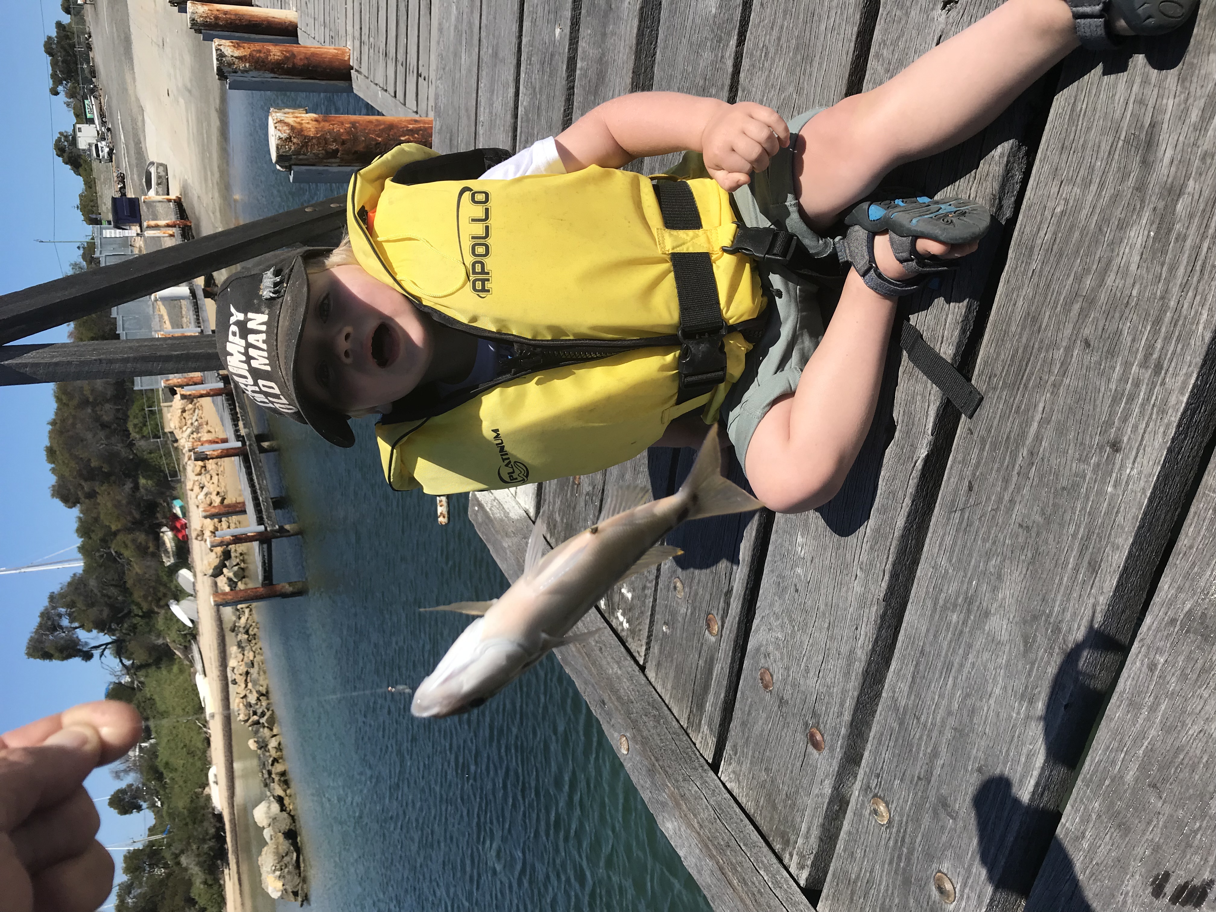 Tie there favourite truck to closed face real . They soon learn how to reel truck in. Take them to local jetty . Don’t let them wipe hands on wooden jetty. Cost to much in lollies whilst pulling out splinters.