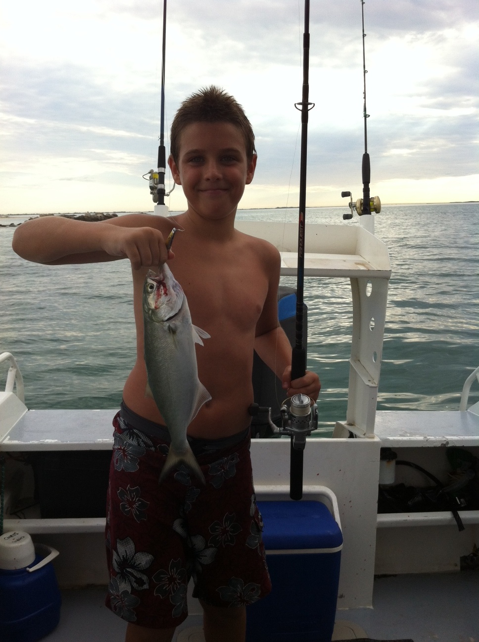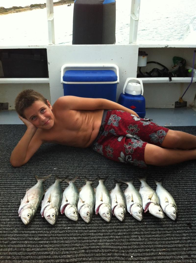 Finally managed a leave pass on Friday 27th to get out for a much deserved fish, Met up with a couple of mates and went out in awesome conditions for a bit of a troll around Cockburn sound for sum tailor. Spent a ½ hr at the first spot but no hits, was a little bit of weed around which was fouling up the lures so we decided to move. Next spot we thought we would up our chances and run a 5 rod spread and a couple of minutes later all hell broke loose when 4 out the 5 rods got smashed just as we hit the mark. My 11 yr old son was going to have to learn pretty quick how to land a decent tailor as all of us were hooked up and he was on his own, he had a good fight all the way to the boat only for it to flick the hook meters from the boat then mine to follow, with both my mates managing to land a couple of 35 cm plus choppers to start the count. Over the next 2 hrs it was on for young and old with fish flying over the gunnels and heaps more not wanting a bar of it and flicking hooks during their amazing aerial displays. At one point the lure would get smashed as soon as it was thrown out in the spread(Mainly the shotgun which was mine).Catch of the day went to my son Hayden with his PB 40 cm specimen (pretty sure it’s the biggest fish he has ever caught) Needless to say he was stoked and so was i as we had the 2 biggest tailor for the arvo, Mine going just over 39 cm.