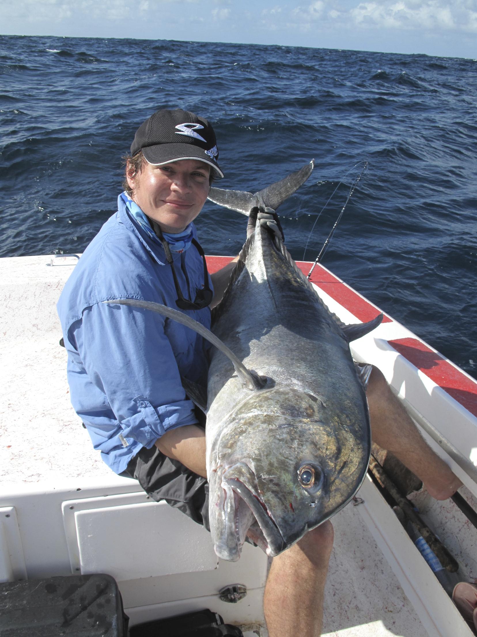 To finish up we went back for an afternoon session at the place we’d gotten the doggies on day 3. Unfortunately I’d had issues with an aftermarket handle on my heavy jig combo (rendering the reel unusable), so was down to using my lighter reel (spooled with PE5) on my heavy rod. This wasn’t an idea setup, and I got blown away on the first two doggies which I hooked, during which time Erin got a nice doggie and Tom had landed a nice GT. Determined to get one last good fish for the trip I re-rigged and dropped again, only to get a cracking great hit on the jig. Line was flying off the reel under full drag and I knew straight away that this was a really good fish. The runs were blisteringly fast and erratic in the dogtooth style, but the thing felt really weighty and I had some doubts as to what it might be.