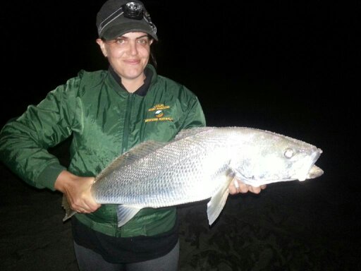 first day we got there early and went spinning at oyster reef for tailor and got some good fish misses got her pb at 75cm while i done every thing but land one that night with a couple big fresh tailor what else was there to do but go chase mullas and after a few 80cm mullas and a pink to tangles i hooked this steam train 25kg of mulloway defently my best fish to date