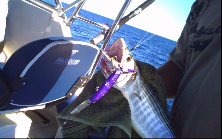 After heading out early morning and trolling in the 90m-110m mark, not getting any fish hooked up, headed back to the 30m contour where we had picked up some Bonito and SBT's (up to 2kg) the previous weekend. Didnt catch any SBT''s there either but we did manage to catch 7 Bonito's.