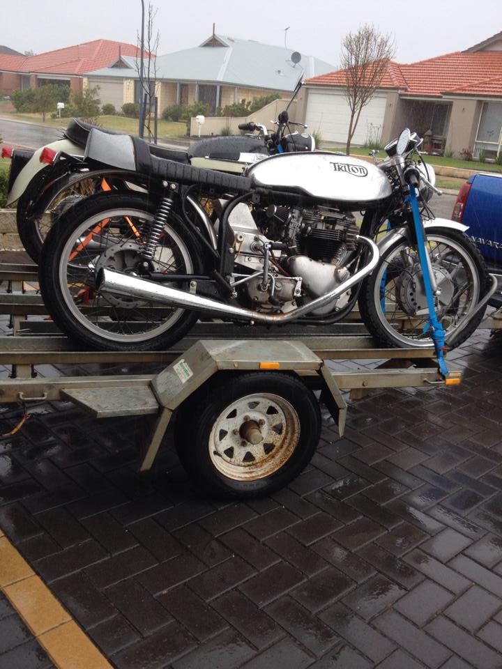 the Triton is a 650 triumph engine that runs on ave gas mounted in a Norton slim line featherbead frame front brake is a twin leading shoe of a Norton commando all engine mounts were hand made Borrani rims it goes like stink and handles like it is on rails I intend to take it to the vintage and veteran Australian race championships in Victoria next year if I can get a decent rider for it , the other bike is a 1962 600cc Norton Dominator 99 (very rare) that is a 1 kick starter running on premium unleaded with a fuel additive , got my eye on a 1928 Rudge that is a runner and a Manx Norton that is seized but would be a good project this is the best hobby you can have when the weather is to crappy to fish