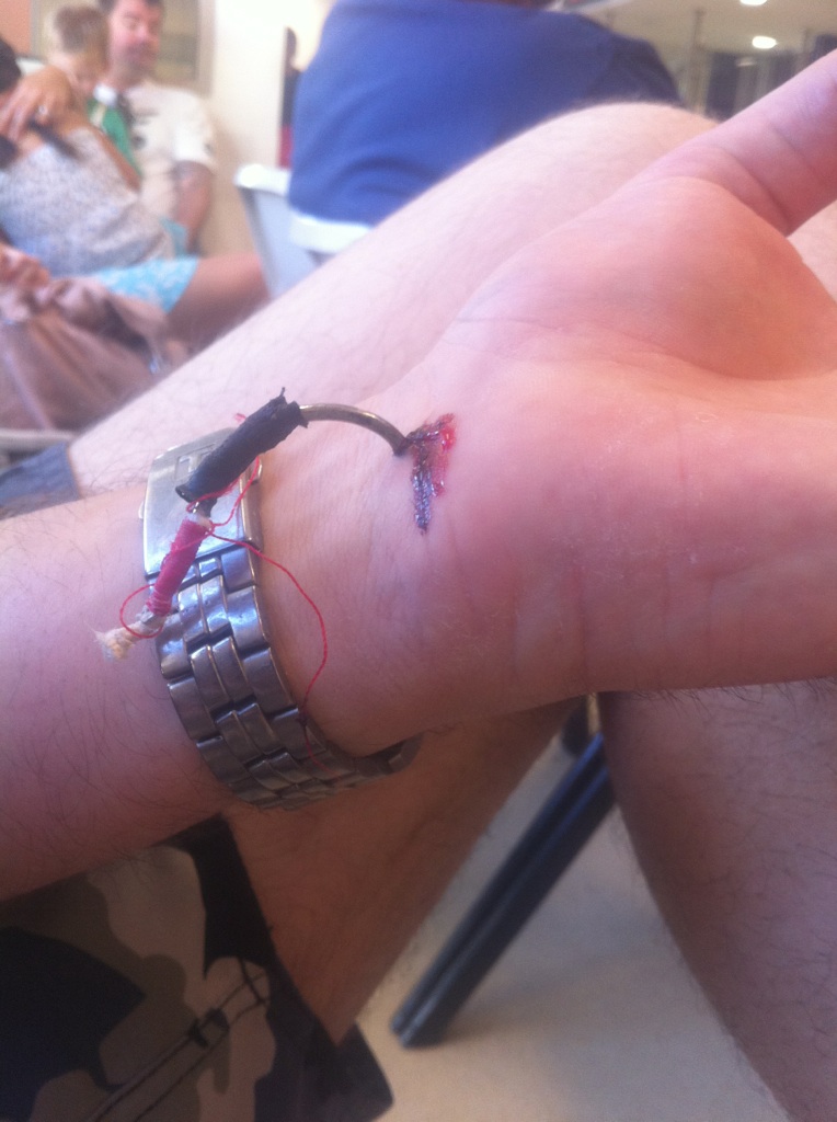 Looks a lot worse than it is, the hook went in essentially parallel with my wrist so the hook only went through the skin and not into the "meat". A quick trip to Joondalup Health Campus and all sorted. Only fun part was cutting a hole to push the point through to cut it off with bolt cutters!