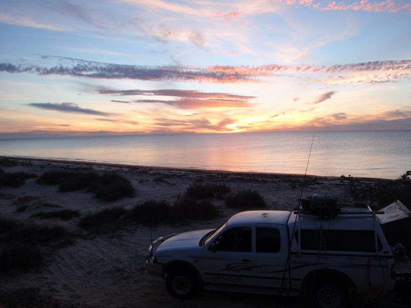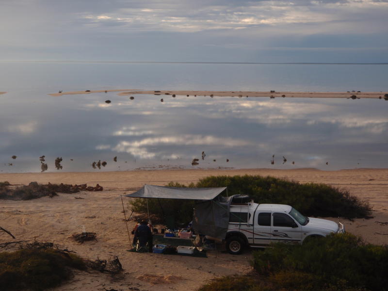 Continuing on it wasn't far to the turnoff and then we got our first glimpse of shark bay. The plan was to head straight up into the national park and camp at Bottle Bay, as the old man had heard it was a good spot. First disaster- the tracks were closed due to the rain. That left us with only the 'bottom half' of the shark bay peninsula to choose from. We ended up following a trakc onto the east side that went along the beach a bit, and set up camp. Its really shallow on this east side, but it just so happened that when we arrived it was high tide.