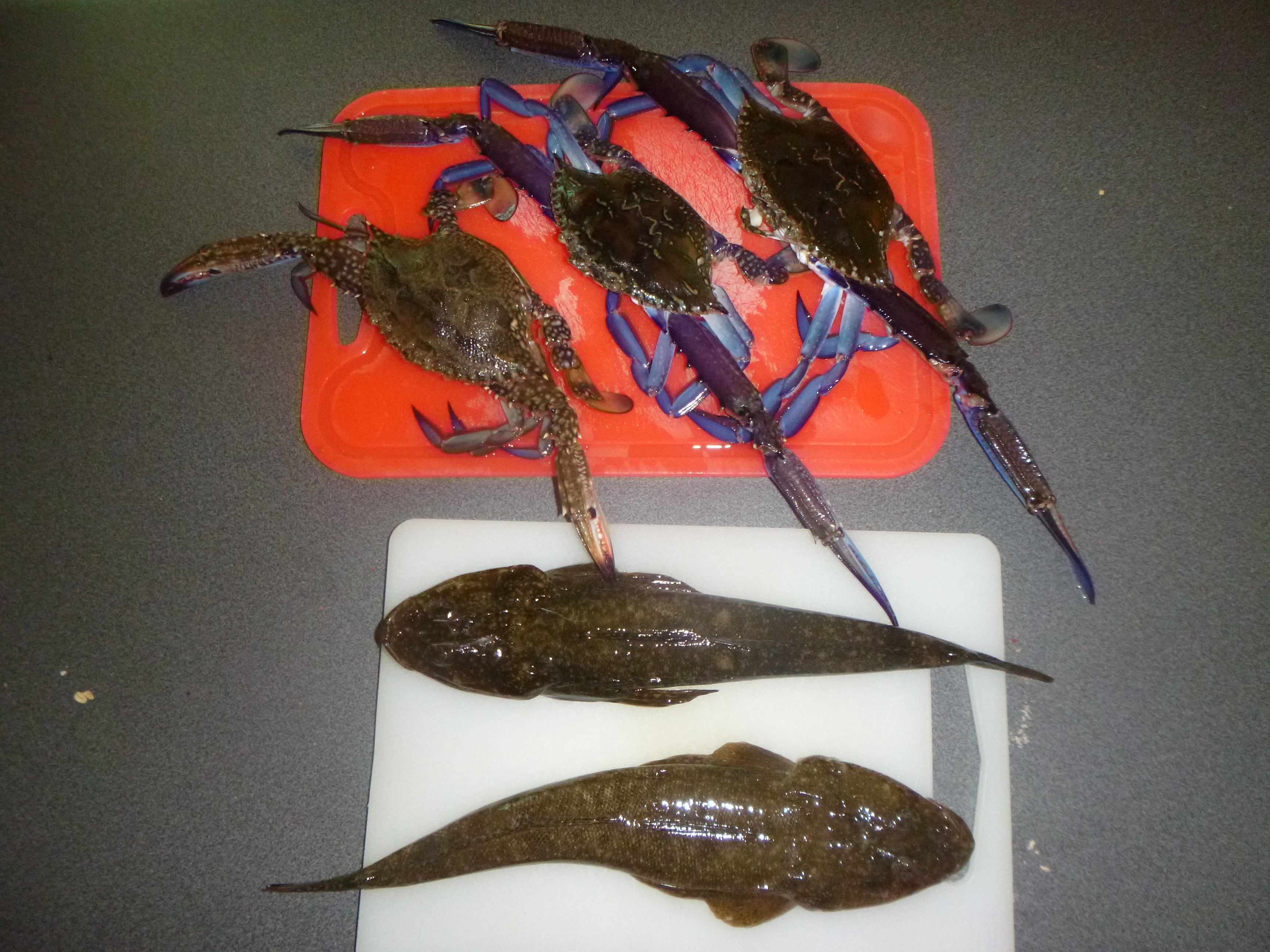 After enjoying an awesome arvo feed of KG whiting (for the first time) and defrosting some stored abs, managed to turn the frames (as crab bait) into some nice blueys and two nice flatties on a lime-green vibe in between drops around Nedlands-Point Walter, probably the two funnest days fishing I have had for a while. Gotta love summer...