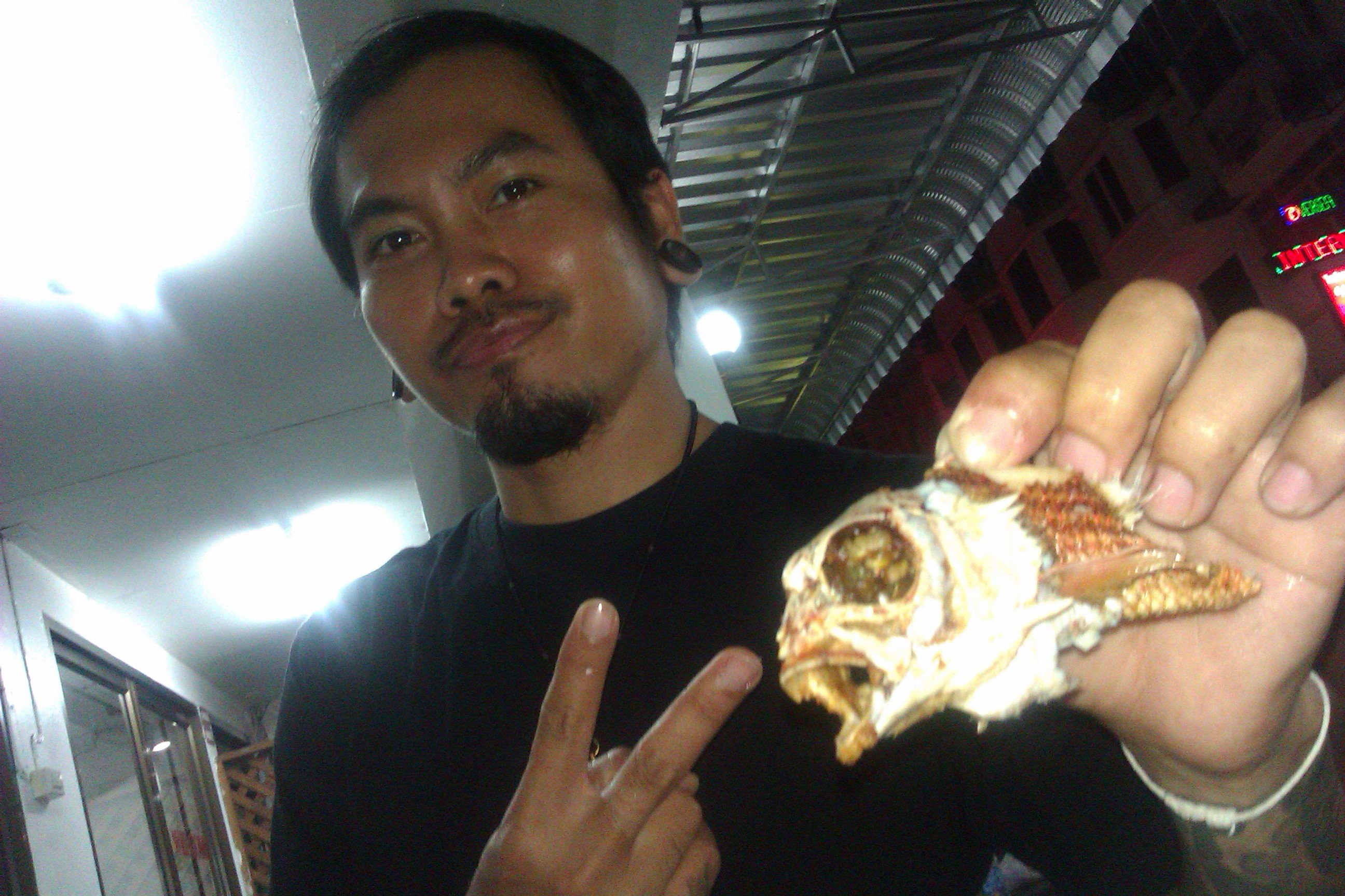 I actually went to get some tattoo's but after speaking with the guys realised a couple of them where mad keen fisherman, one of the guys showing me pics of snake head he'd been catching in little lakes/ponds dotted around the place (i really want to catch one of these next time, kept waking up about 2pm and he was telling me mornings were best). Next stop tackle shop, I was a bit disappointed with the gear there although he did stock some ok stuff like a couple of stella's and twin powers, a few accurate reels ect ect. I bought a little penn battle 3000, matched it to lemax slim max 8-20lb 7ft 2 piece rod and some 12lb line, a heap of lures sinkers hooks ect were also purchased, all up about $230 oz so no biggy. Next night we went for a fish at a local jetty after i spent 6 hours sitting in a chair getting tatt's done, nothing caught but was still fun. A couple days passed and another 6 hours in the chair and one scoota accident and 2 hours sleep we were off for a fish around some islands, the boys (my taxi driver and one of the artists from the shop offered to chip in but again for less than $100 au was my shout). I was extremely hung ova and cuts on knees elbow feet ect but enjoyed it nonetheless, the skipper cleaned up using a handline catching things that i would describe as spanish flag/stripeys from up north tiny coral trout/cod things that looked like small nannagai but striped, plenty of small nw snapper type species and a couple respectable size trigger fish. After a long day we pulled into a bay where they proceded to catch 4 squid in quick succession, and i got a big surface hit from something on a squid jig, one of the boys was saying they get quite a few small GT around the area but the water was a bit warm at the time. Most of these small fish were kept (i have no problem with this they eat em and love it) and were taken to a local resturaunt where the boys paid the cooks to make em up in soups and fried whole, chilli squid and a few other dishes, the guy doing tattoo's absalutely loved it, he's the guy in the last pic. Btw i caught a few fish but had my ass handed to me by the taxi driver and skipper using handlines, massive current light rods with mono and light sinkers just didnt cut it. Also my tatt artist mate snapped one of his rods, poor bloke he looked devastated, couldnt even laugh like i would at one of my own mates.