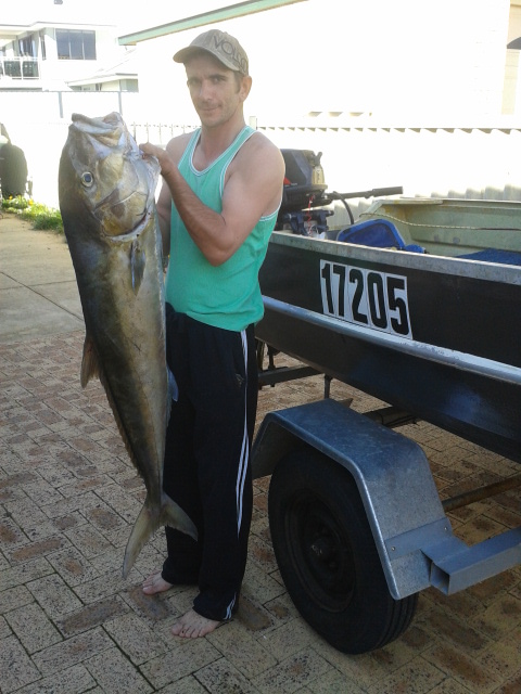 Anyway this thing has run us round the tinny three times and I seen some deep colour and call it for a mulloway. I pulled us right on top of the pick so it was straight up and down and that kept it off the rope. It went round once but we got it off. A couple more circles and I can tell we got it beat. Suddenly it appears again properly and we got us a stonking sambo! And its mrs is right there too. Got it inboard for pics and old mate declares it the biggest proper fish hes ever seen let alone caught and his first sambo and hes gonna bloody well eat it! Absolutley no room in the eski for that, its lunch time so we choof off. Sambo went 1.3mts in 5 - 8 mts of water on 4000 size reel. Needless to say my doubts about that reel are well and truly gone and new rod is a bloody ripper. Tailor for us and the neighbours and sambo belly strips for the dogs. Got some good berley stashed away too now with chopped up frames and smashed up mulies waiting to go again.......