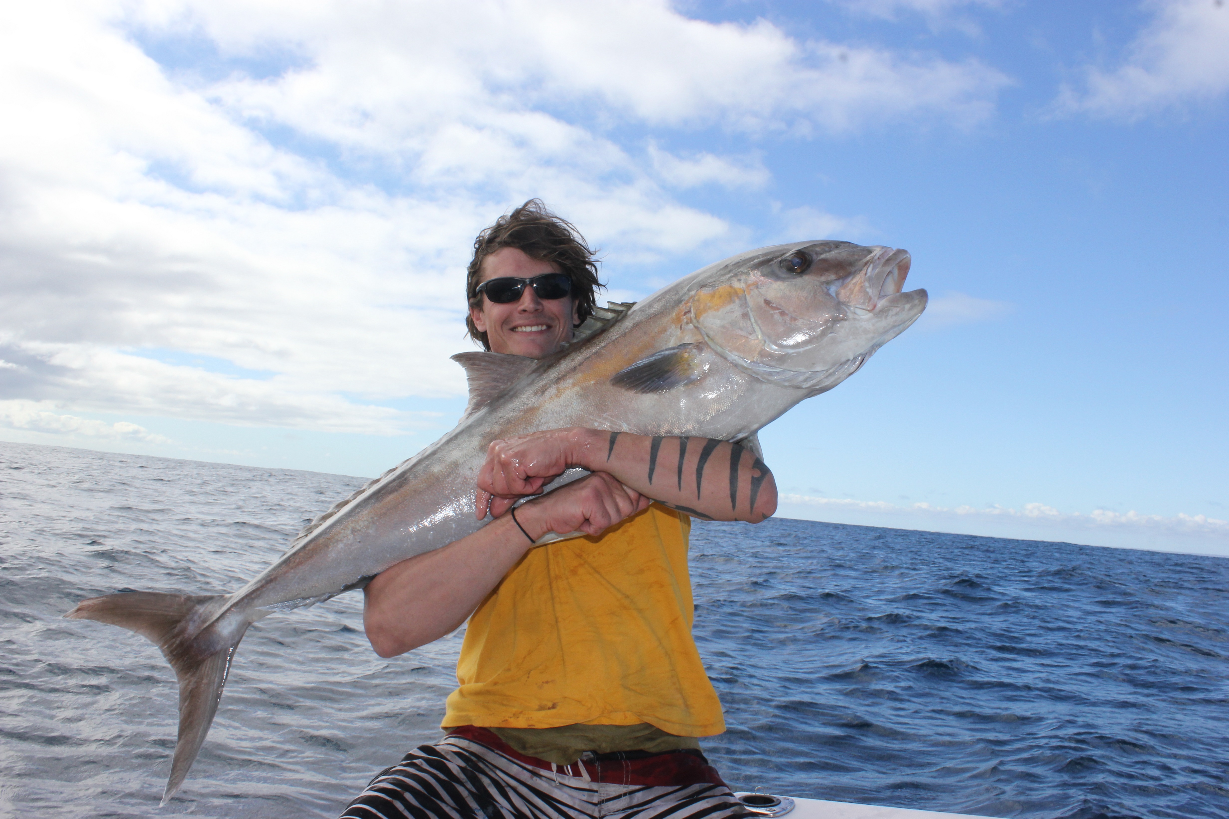 with our dhu limit reached we went to the sambo spot where we jigged up sambos for the next 3 hours with triple hook up's every drift. no monsters with most around the sub 10kg mark. the whales put ona nice show for us about 100m from the boat. also caught a gold spot trevally which surprised us! with the last drift called we did it in stlye with another triple hook up and with my brother dean pulling up a horse and his pb sambo as a rough guess around the low to mid 20's.